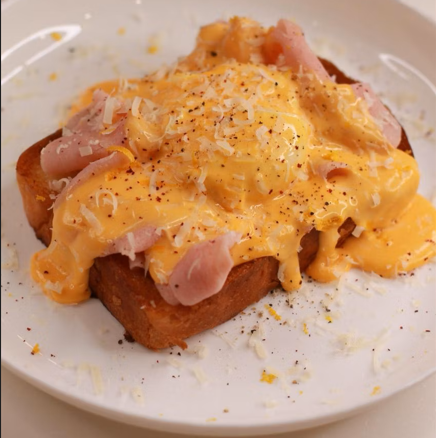 Бриошь собственного производства на сливочном масле с ветчиной, яйцом пашот, соусом Чеддер и сыром пармезан