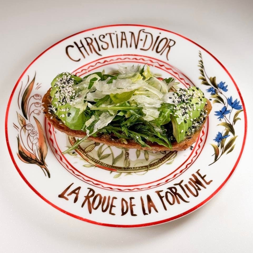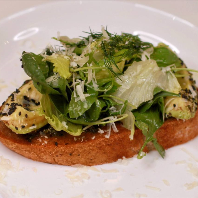 Микс салата, авокадо и соус песто на ржаной чиабатте собственного производства