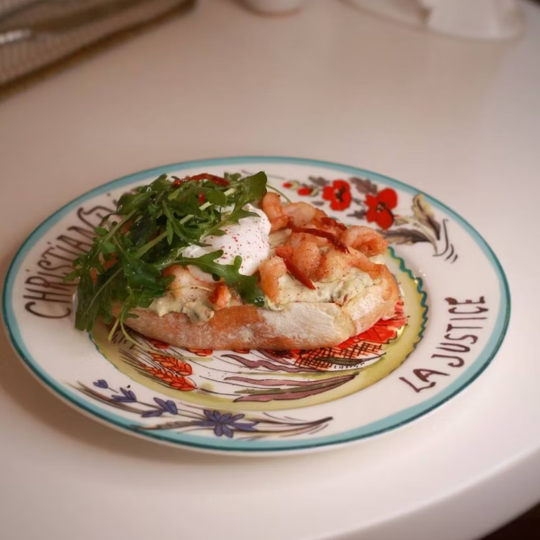 Крем из авокадо и кремчиза с тигровыми креветками на свежей чиабатте собственного производства, подается с рукколой, вялеными томатами и яйцом пашот