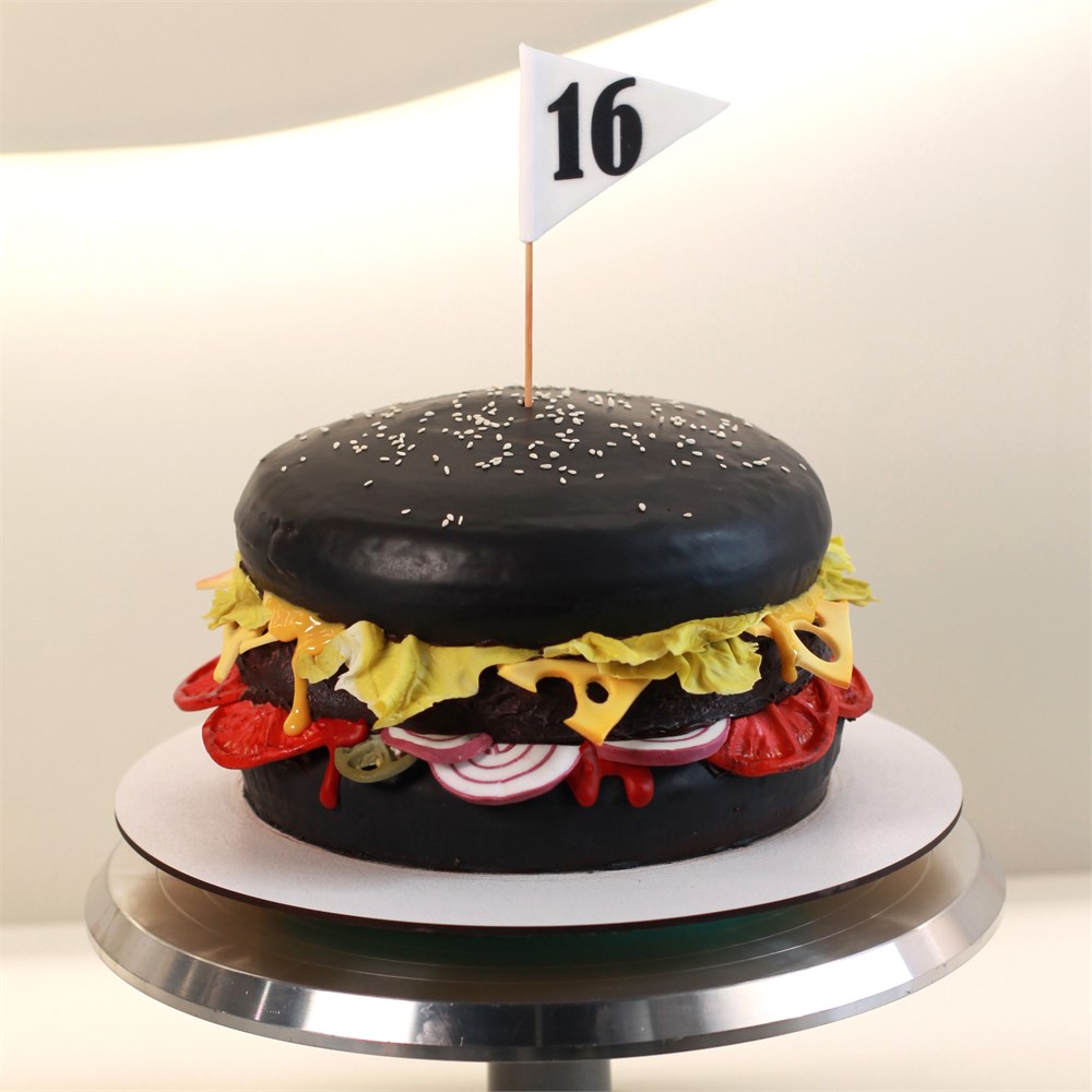 Торт в виде реалистичного бургера, декор выполнен в смешанной технике с использованием какао-масла, шоколада, сахарной пасты, зеркальной глазури. Сверху торт украшен настоящим кунжутом.