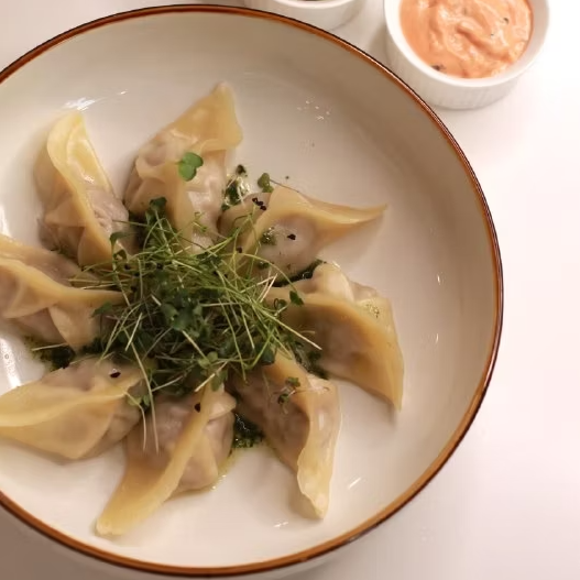 Фарш из свинины и телятины с луком в пшеничном тесте с соусом Майо (домашний майонез, томатный соус, кунжут) и топпинг на основе соевого соуса и сладкого чили