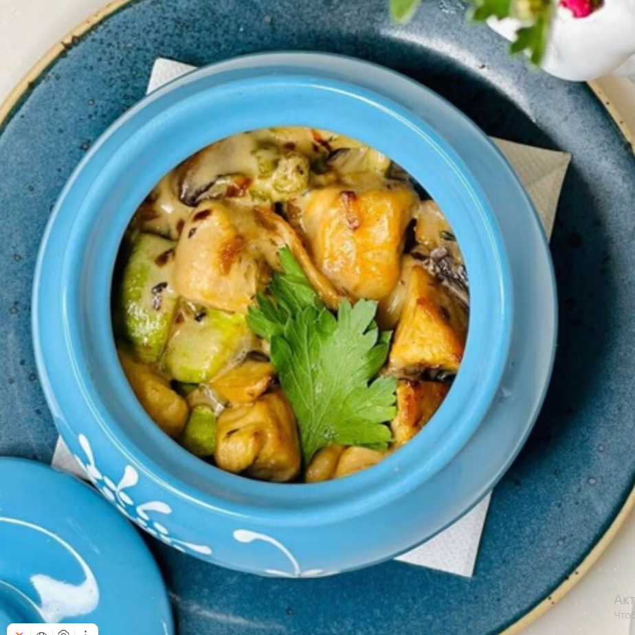 Фрикасе с индейкой и булгуром с добавлением цуккини, стебля сельдерея, лука, тимьяна в сливочном соусе с шампиньонами и белым вином.