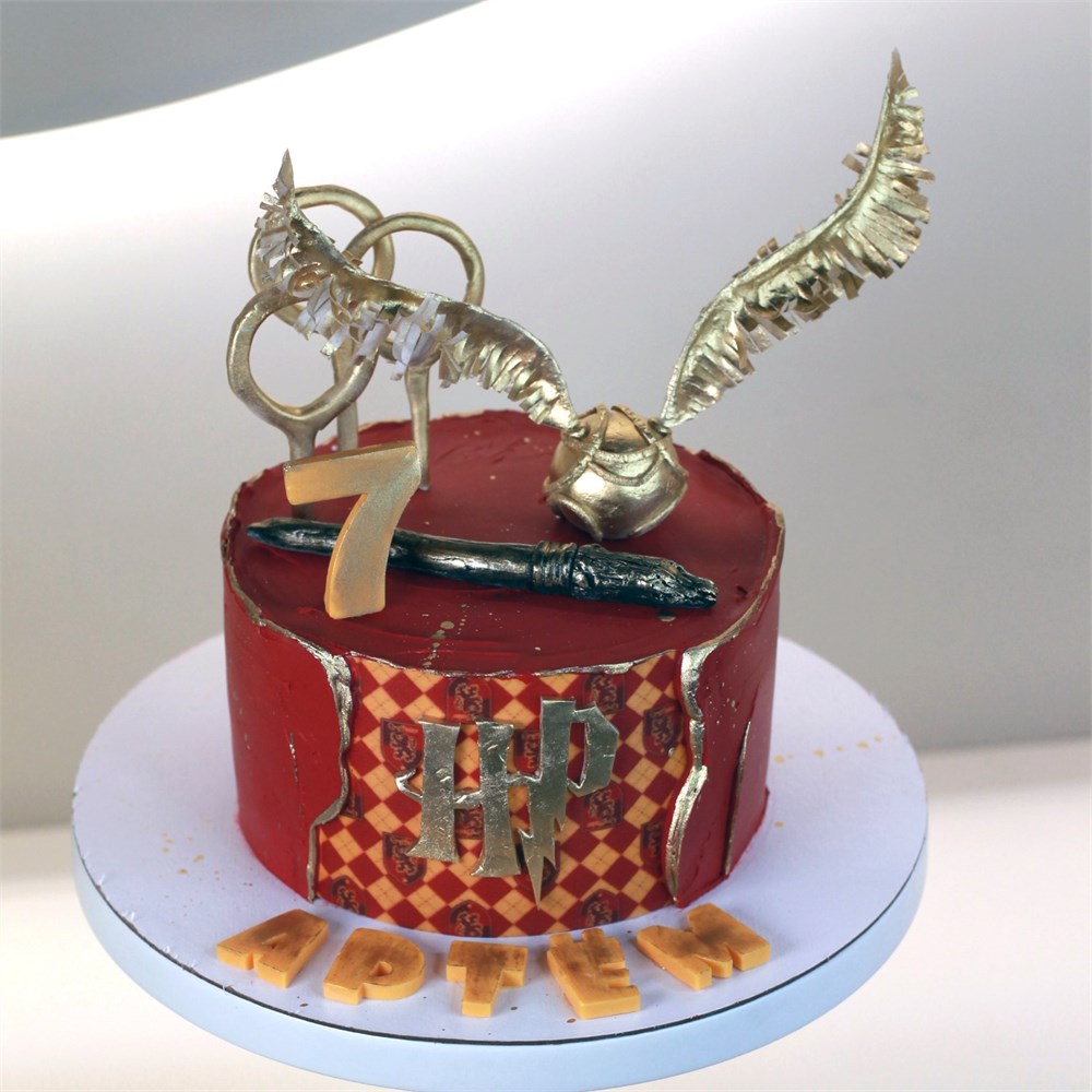 Декор в смешанной технике: золотой Снитч, ворота, волшебная палочка из сахарной пасты и вафельной бумаги. Имя именинника из шоколада.