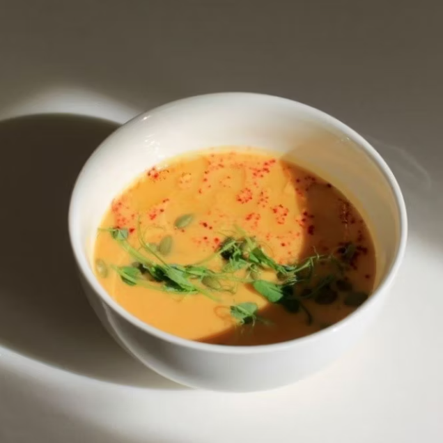 Крем-суп из свежей тыквы, моркови и лука со сливками, с кокосовым молоком, семенами тыквы и микрозеленью