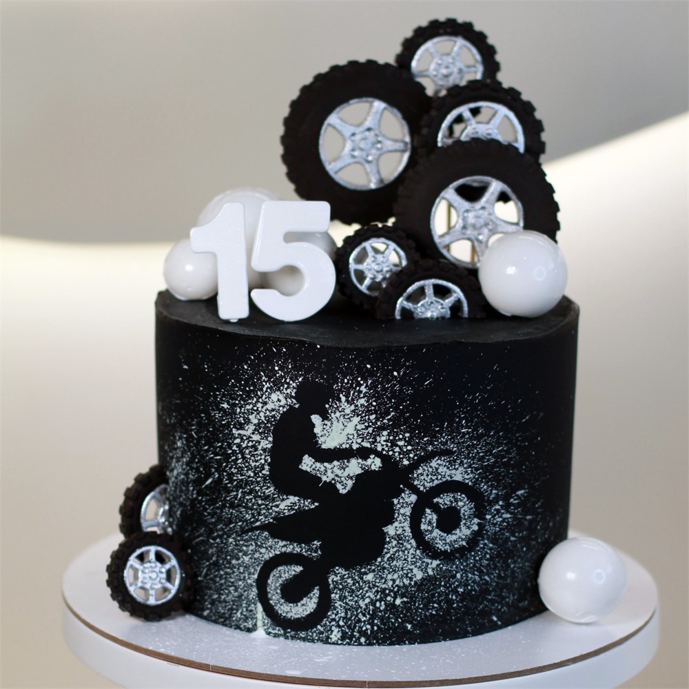 Силуэт мотоциклиста в трафаретной технике, дополнен шоколадными сферами и тематическими топперами из сахарной пасты