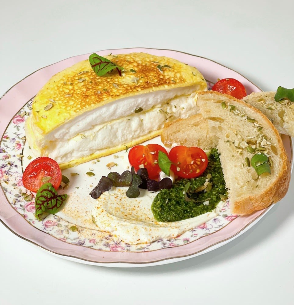 Пышный, воздушный французский омлет Пуляр. Подаётся вместе с нежным творожным сыром, чиабаттой собственного производства, итальянским соусом песто и помидорами черри
