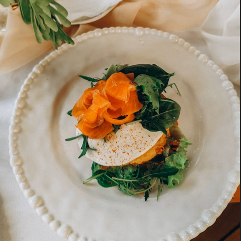 Два драника с моцареллой, дополненные свежей зеленью и спелым томатом. Подаются с форелью слабой соли и сметаной 300 гр