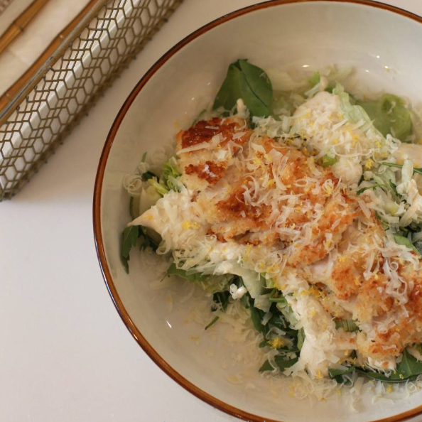 Хрустящая индейка на подушке из микса салата с добавлением соуса Цезарь и сыра Пармезан