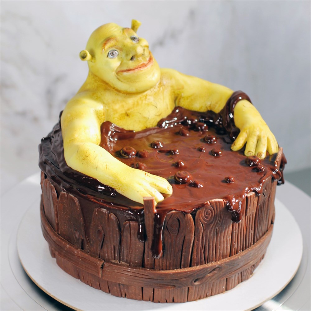 Шрек выполнен из сахарной пасты, реалистичный забор из пластичного шоколада. Шоколадные пузыри из ганаша