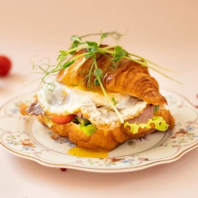 Круассан собственного производства на сливочном масле со слайсами говядины, миксом овощей, горчичной заправкой, жареным яйцом и свежим листом салата