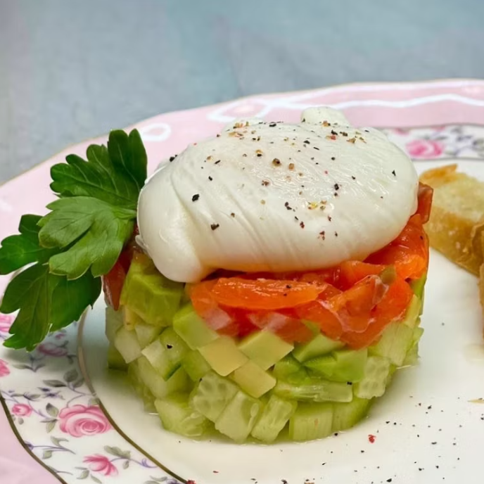Холодная закуска из мелко нарезанного лосося, авокадо и огурцов, сверху выкладывается яйцо пашот, подается с ломтиками чиабатты собственного производства