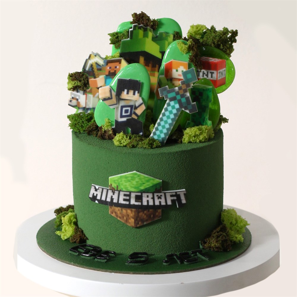 Торты покрыт бархатным шоколадным велюром и зеленью из бисквитного мха. Декор дополнен сахарными топперами, изомальтовыми леденцами