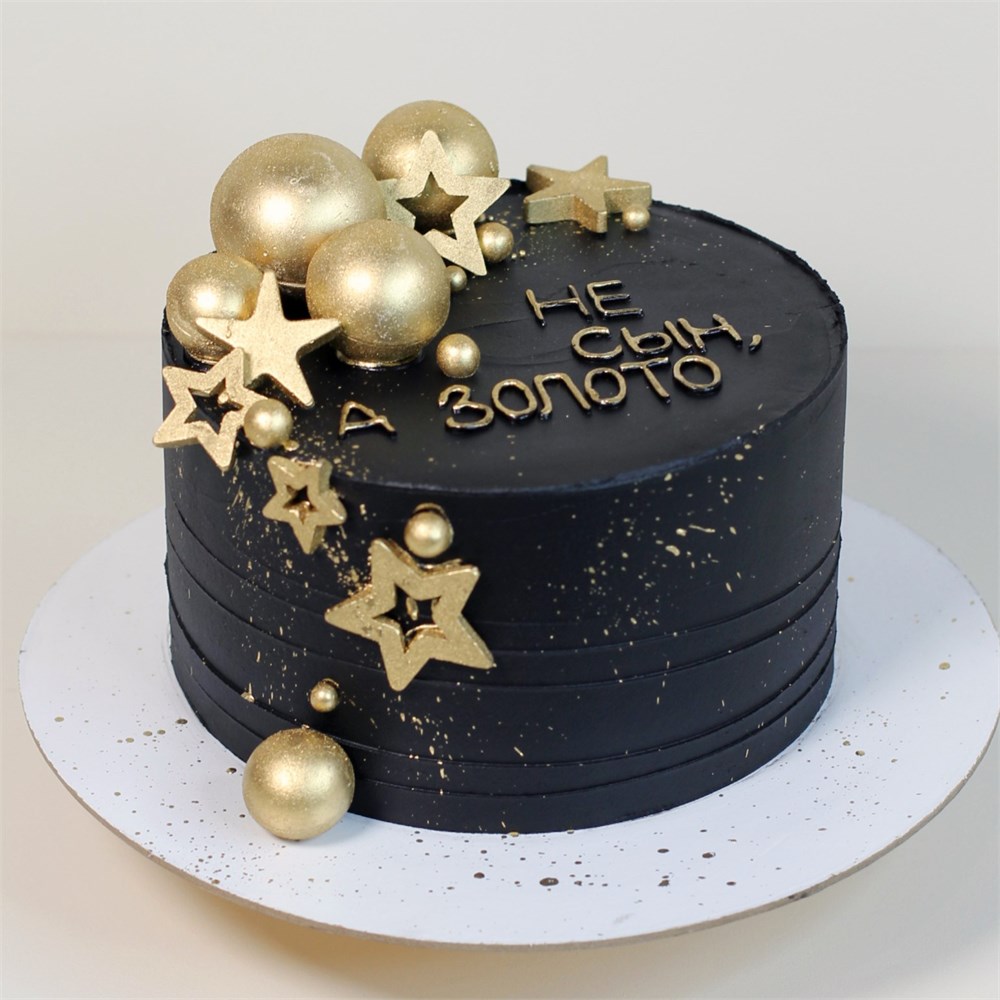 Декор из шоколадных сфер и звезд, припыленных золотым кандурином. Дополнен надписью.